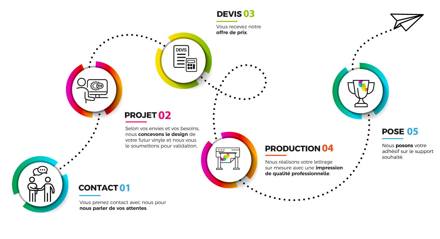 Nous concevons votre support visuel en quelques jours seulement. Après validation du projet, nous posons rapidement votre vinyle adhésif sur les vitres de votre commerce ou de votre entreprise.